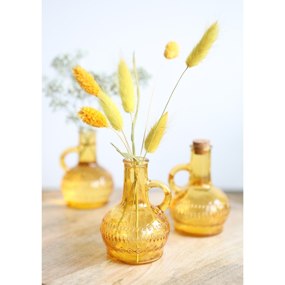 Vase Lille glas ockergelb 10 cm aus Serie Lille hat einen runden Bauch, einen schmalen Hals und einen Henkel an der Seite.